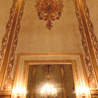 Nous nous retrouvons en haut d’un escalier assez simple qui nous mène devant le Foyer Impérial où l’Empereur reçoit ses ministres et invités privilégiés avant le spectacle. Un espace assez petit mais très chaleureux avec ses canapés capitonnés et le décor entièrement doré.