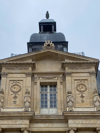 Par ailleurs, pour finir l’ornementation de sa façade aux multiples volumes, Mansart va y intégrer des pilastres et des colonnes issus de trois ordres classiques différents: l’ordre dorique au rez-de-chaussée, ionique au premier étage et corinthien au dernier. C’est aussi sur l’avant-corps que se concentre les principaux décors : sculptures, bas-reliefs… on remarque d’ailleurs sur le frontispice deux visages gravés dans des médaillons. Il s’agit de René de Longueil et son épouse Madeleine Boulenc de Crèvecœur.